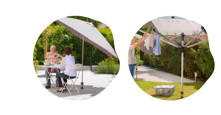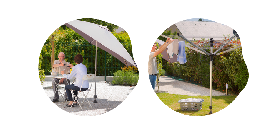 In caso di piccoli spazi esterni, in particolare per le case di città, è possibile alternare le attrezzature su un'unica base di ancoraggio in modo da agganciare, per esempio, uno stendibiancheria al mattino, un ombrellone il pomeriggio e una lampada solare Gard&Rock in serata. In altre parole, potrete organizzare molteplici attività nello stesso, piccolo spazio.
