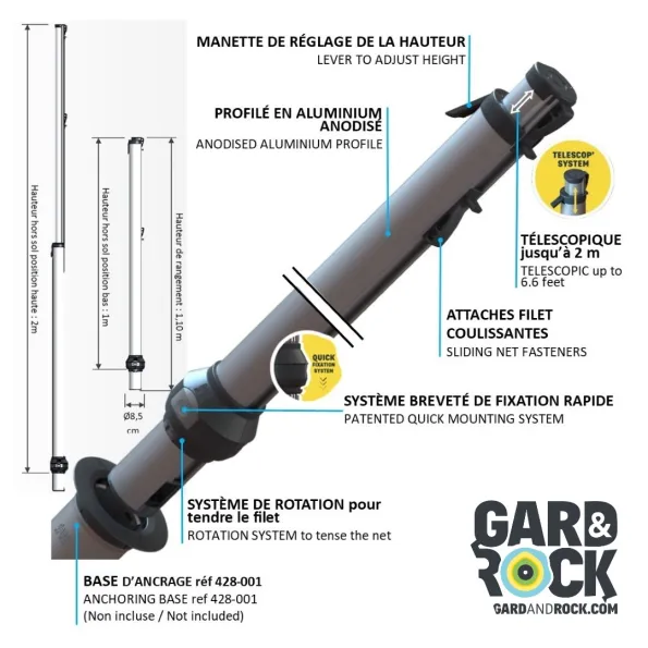 Dotato di una funzione telescopica, è possibile alternare facilmente le discipline e adattare l'altezza della rete per i giocatori più grandi e più piccoli.